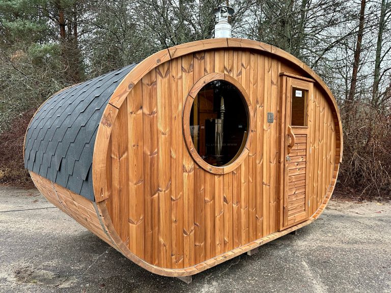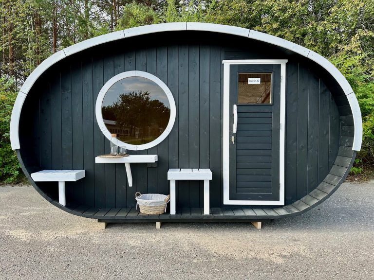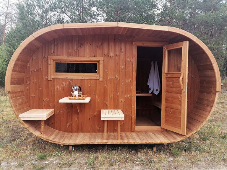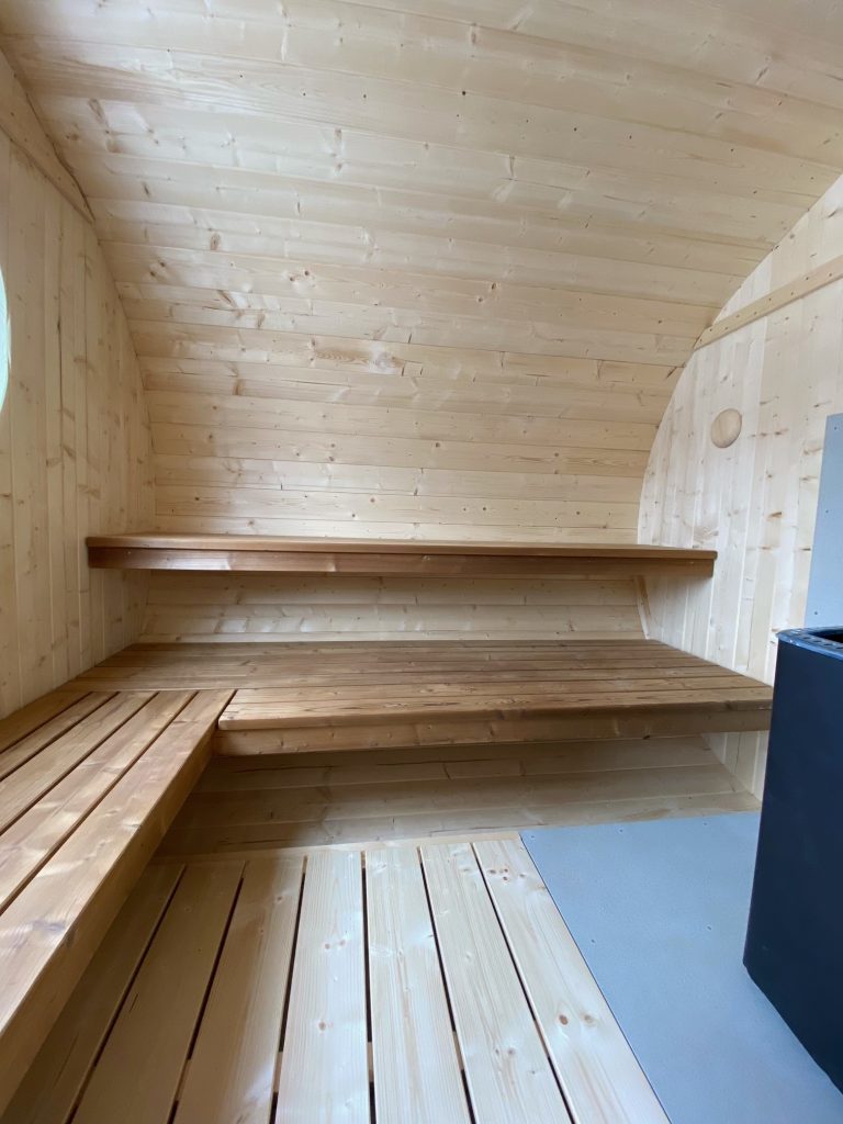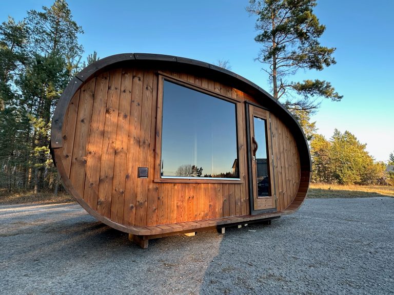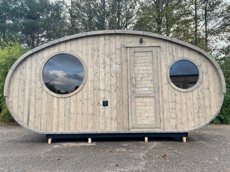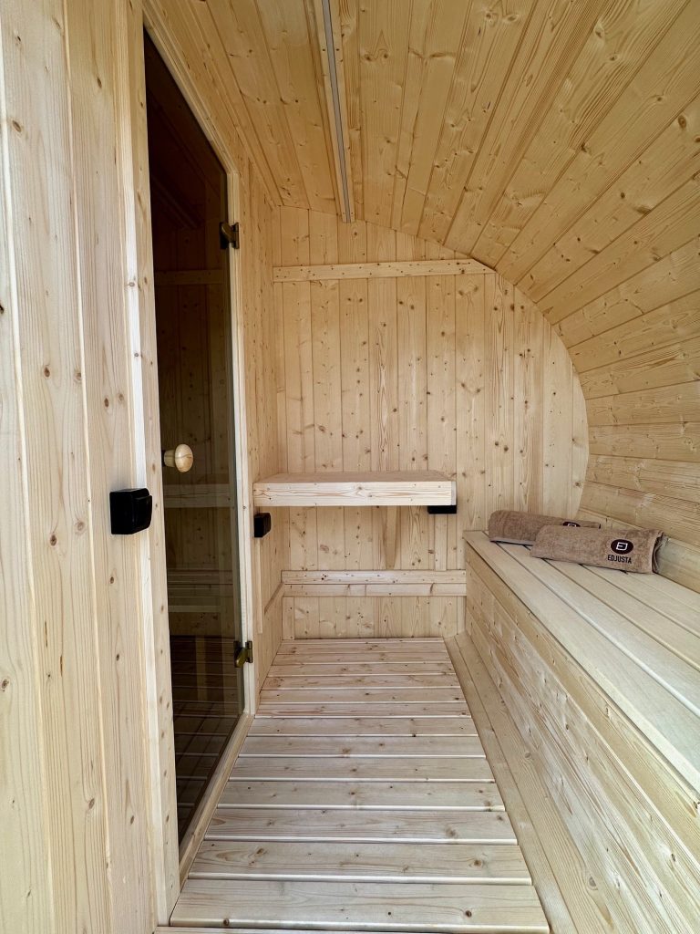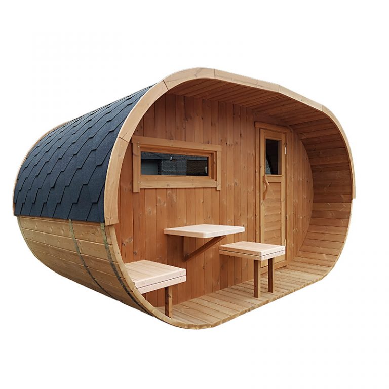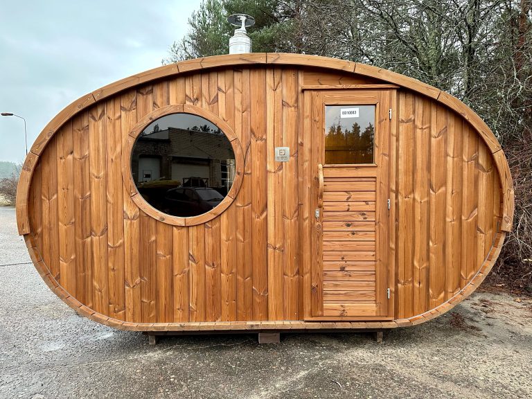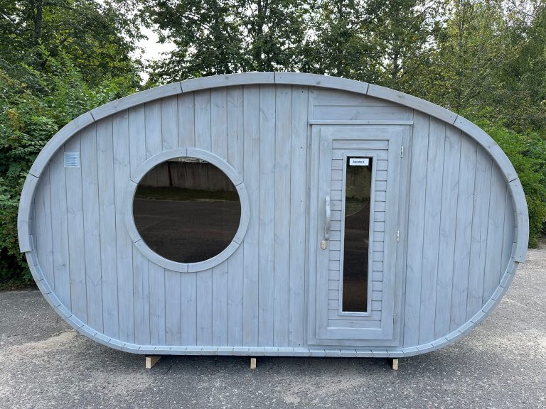 Dies ist ein völlig neues Modell, bei dem die Breite der Sauna erweitert wurde. Optisch ist sie völlig anders und hebt sich sofort von den Standard-Saunen ab. Die ovale Sauna kann als zusätzliche Option mit einer großen Außenterrasse ausgestattet werden. Diese neue Struktur bietet ein Maximum an nutzbarem Raum bei weniger zu beheizender Fläche.