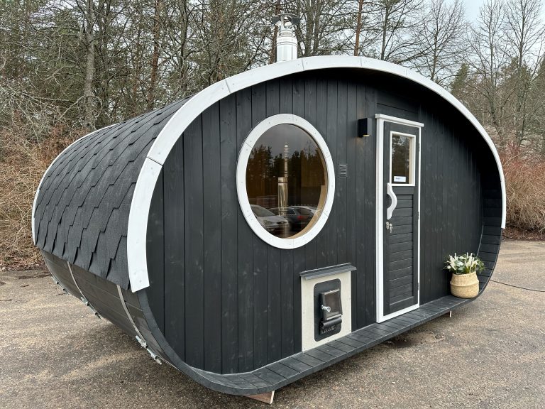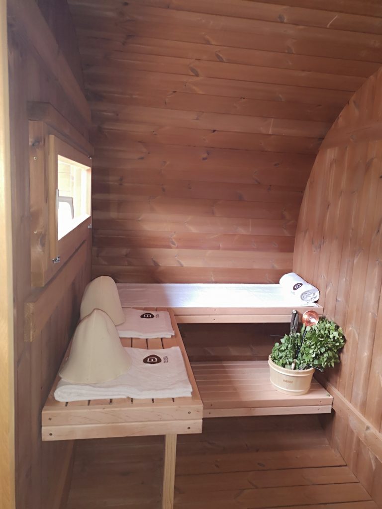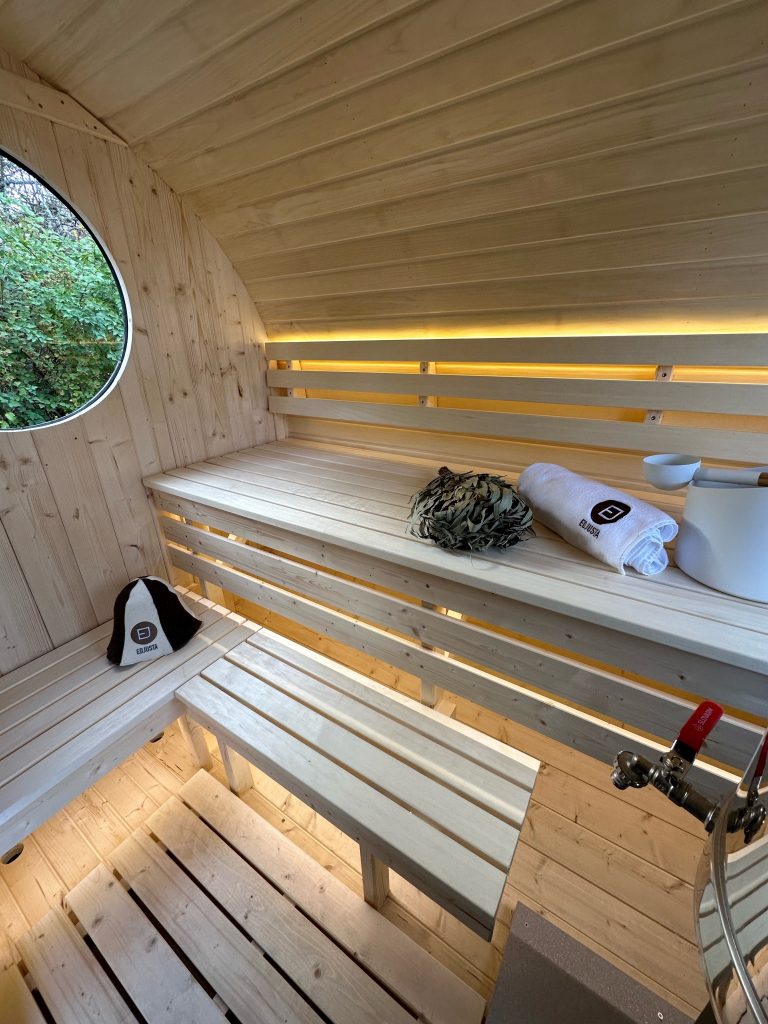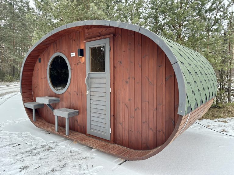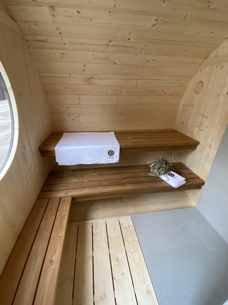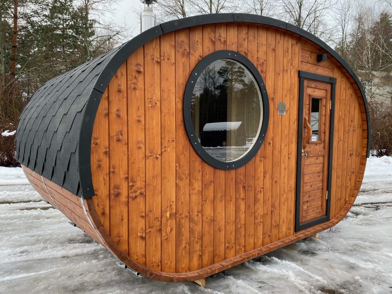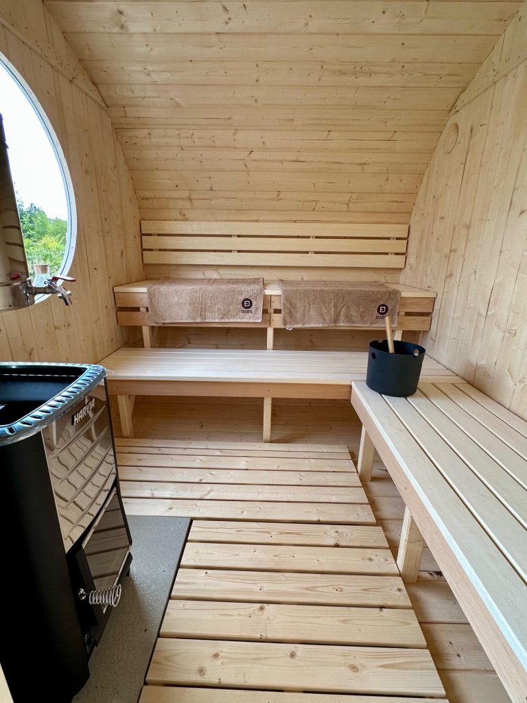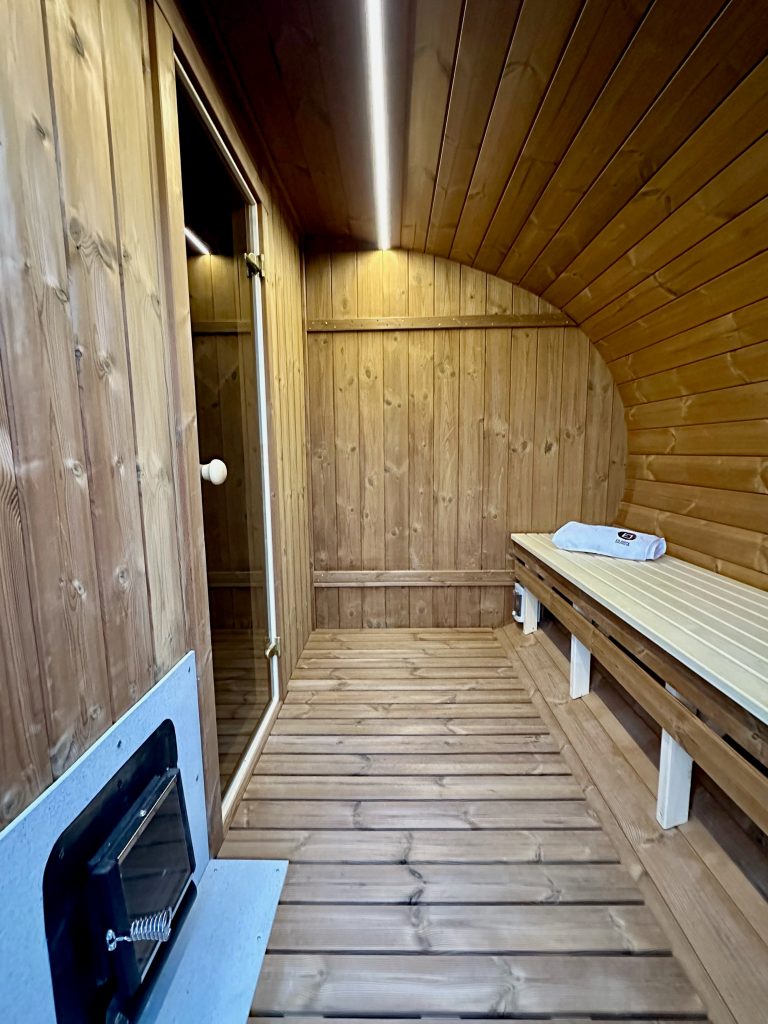 Dies ist ein völlig neues Modell, bei dem die Breite der Sauna erweitert wurde. Optisch ist sie völlig anders und hebt sich sofort von den Standard-Saunen ab. Die ovale Sauna kann als zusätzliche Option mit einer großen Außenterrasse ausgestattet werden. Diese neue Struktur bietet ein Maximum an nutzbarem Raum bei weniger zu beheizender Fläche.