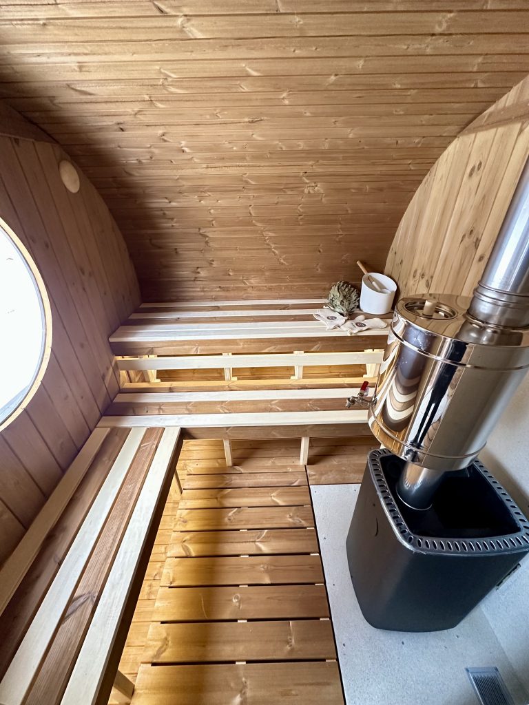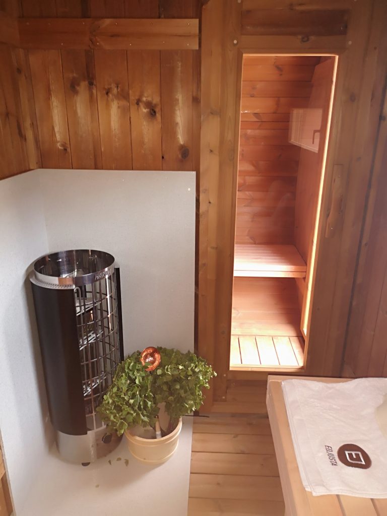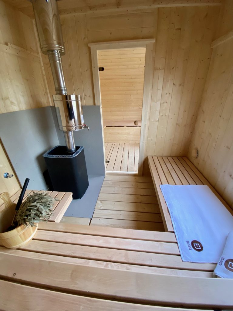 - Holzofen mit externer Holzzufuhr von außen oder aus dem Umkleideraum.