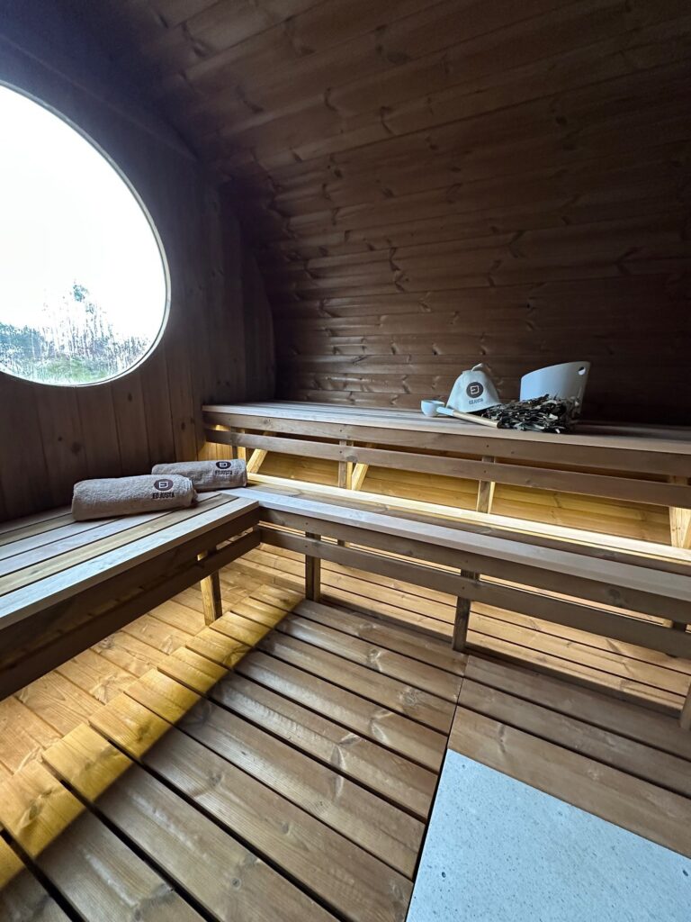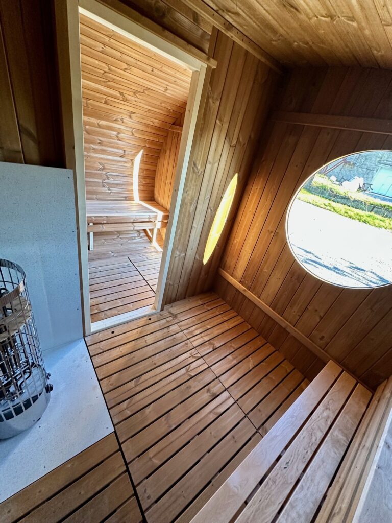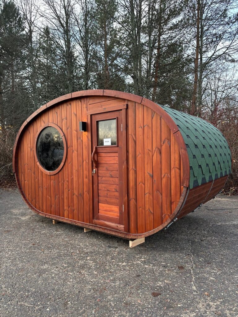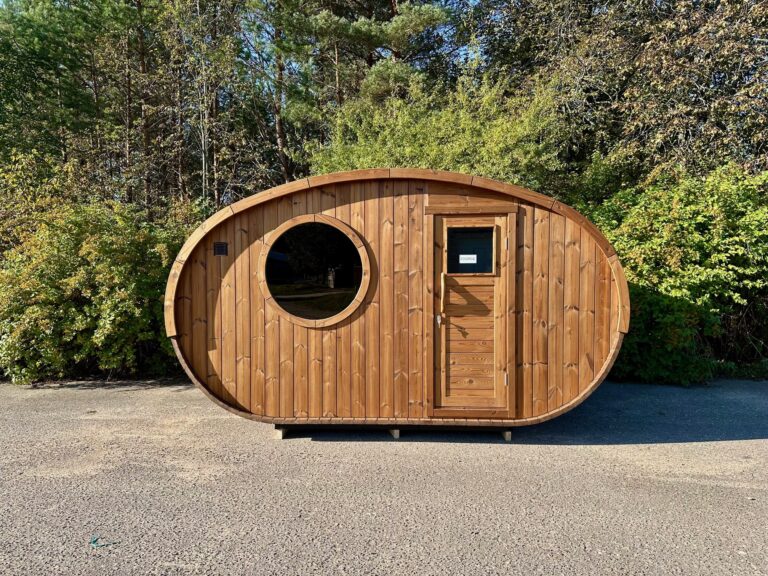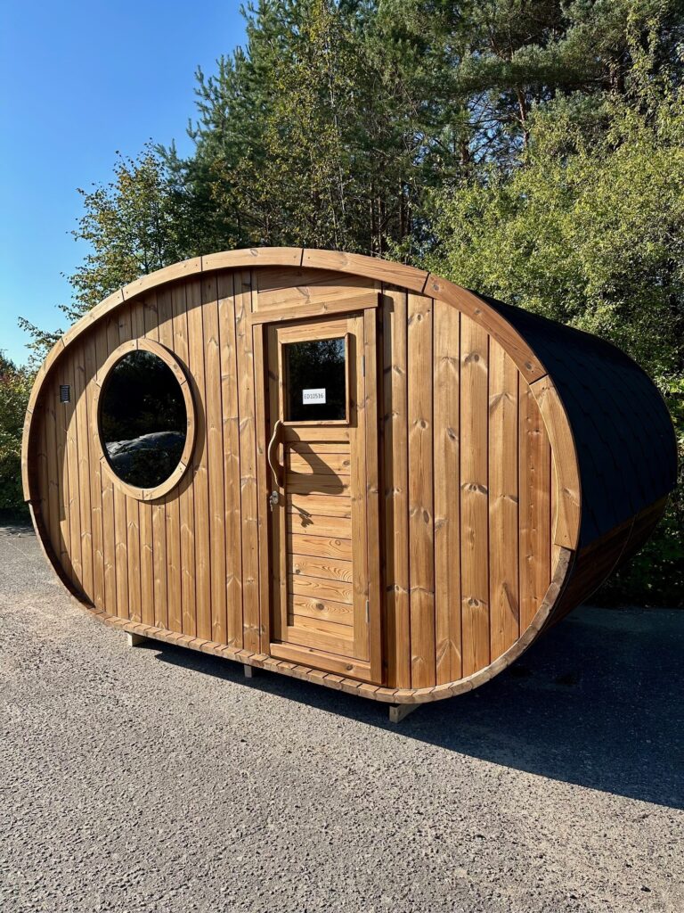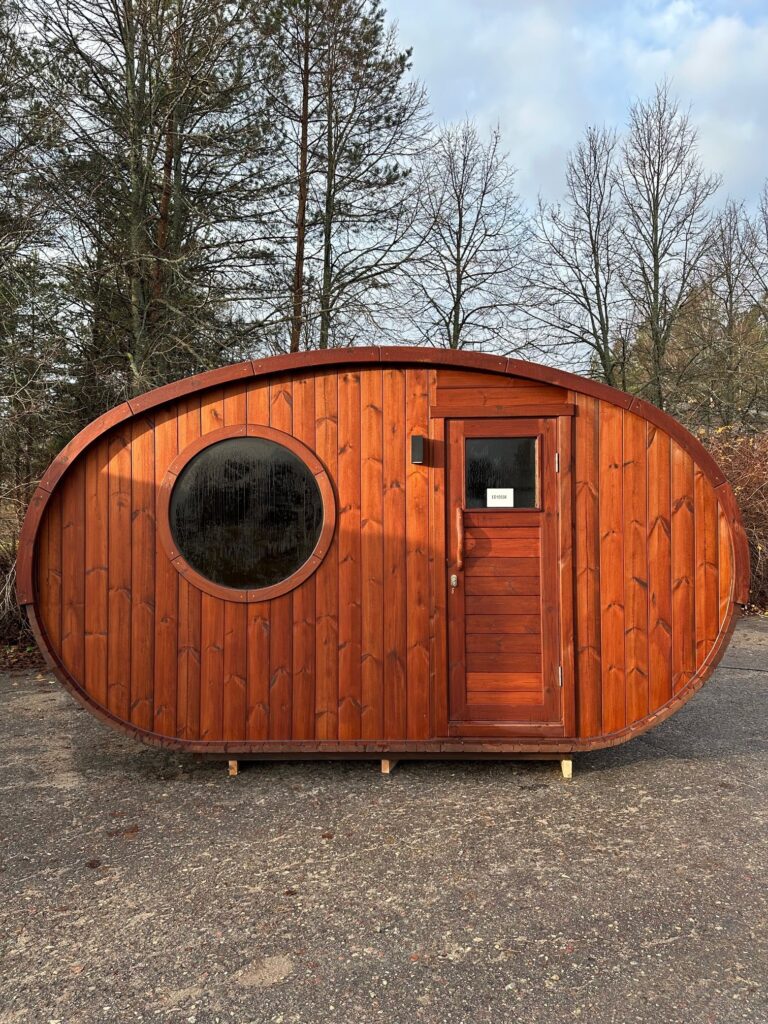 Dies ist ein völlig neues Modell, bei dem die Breite der Sauna erweitert wurde. Optisch ist sie völlig anders und hebt sich sofort von den Standard-Saunen ab. Die ovale Sauna kann als zusätzliche Option mit einer großen Außenterrasse ausgestattet werden. Diese neue Struktur bietet ein Maximum an nutzbarem Raum bei weniger zu beheizender Fläche.