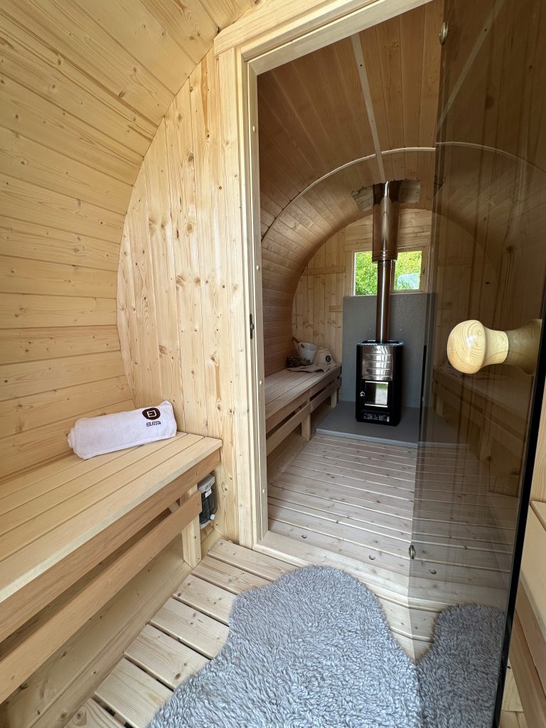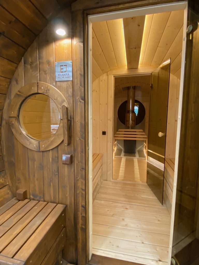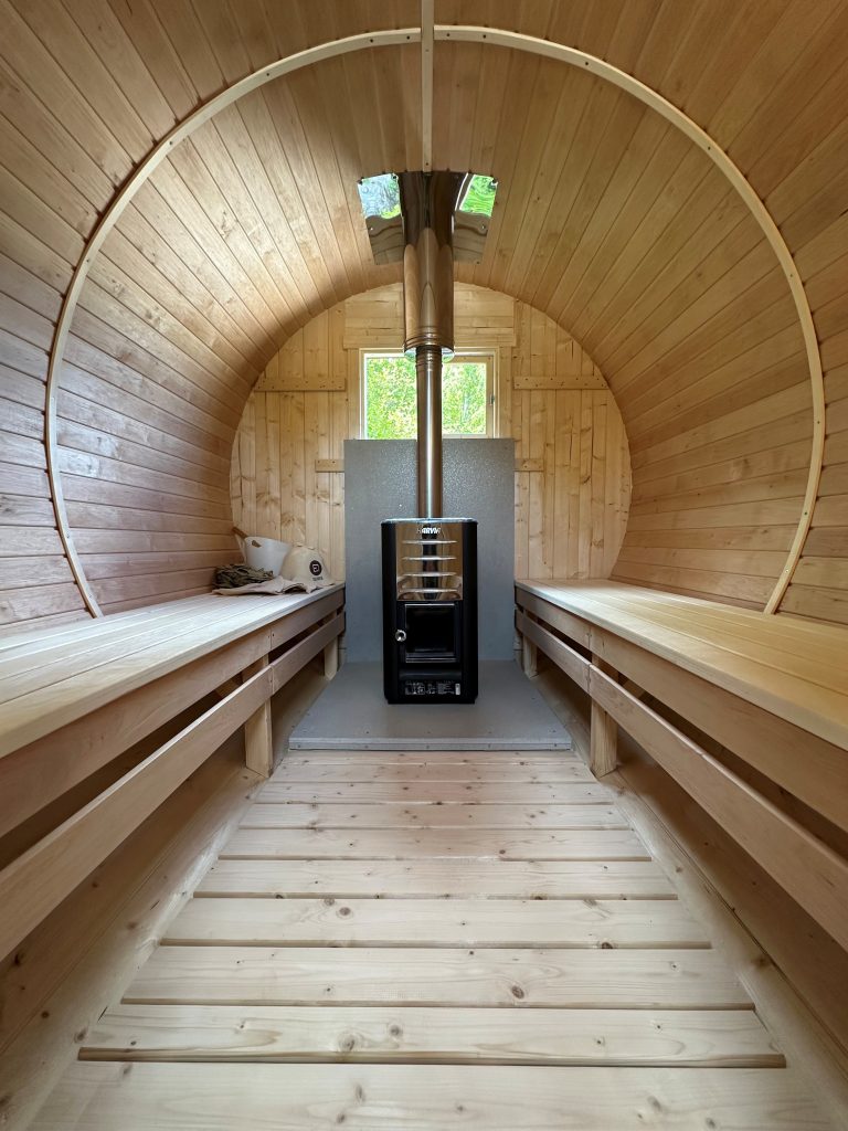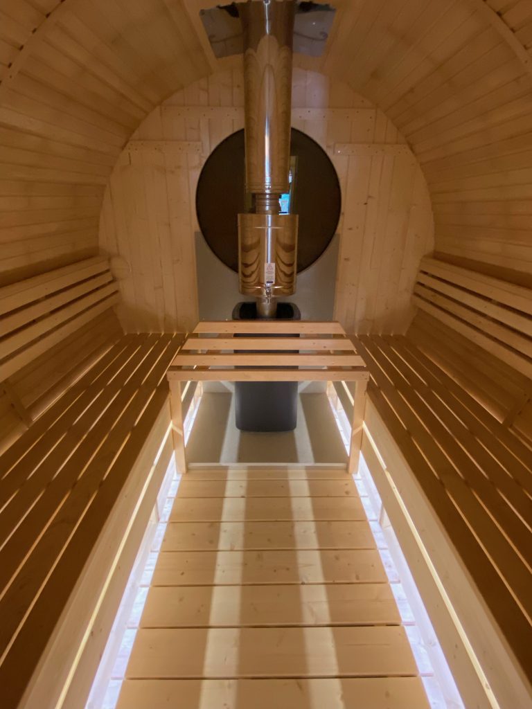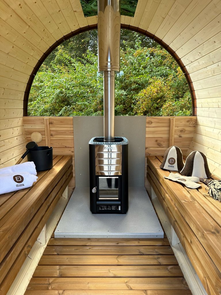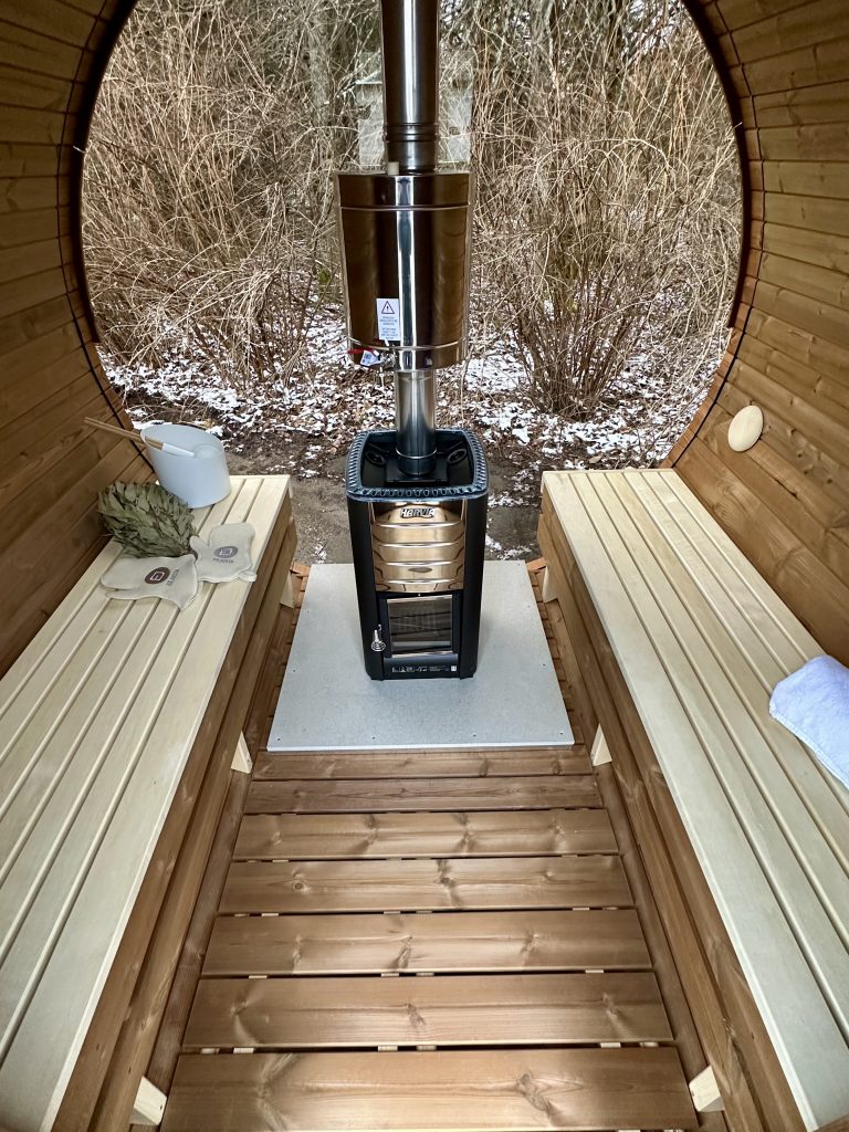 - Holzofen mit externer Holzzufuhr von außen oder aus dem Umkleideraum.