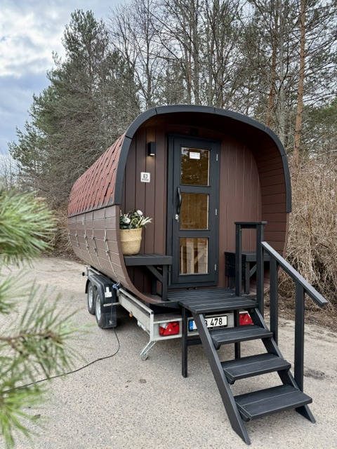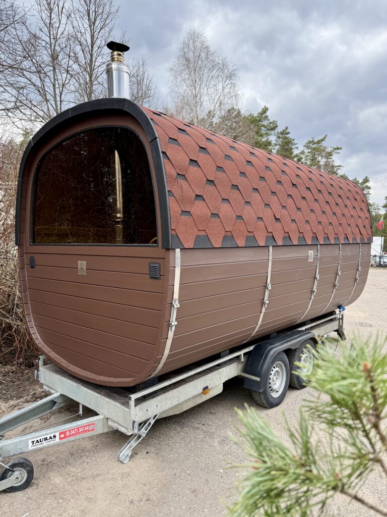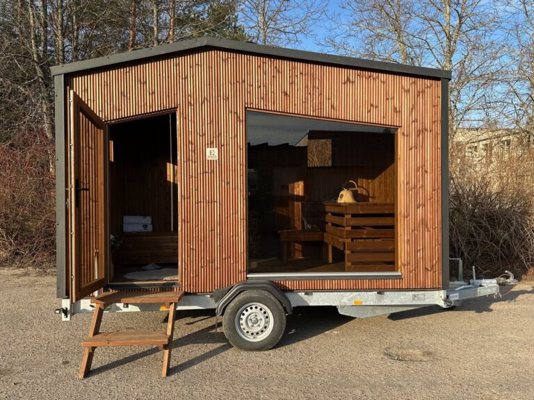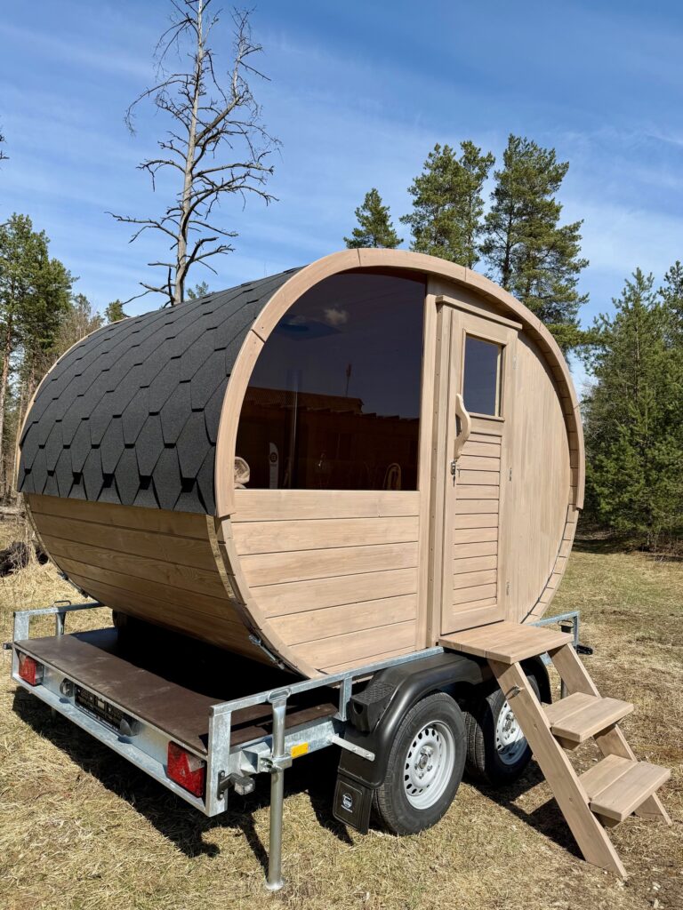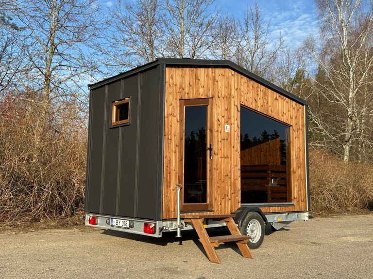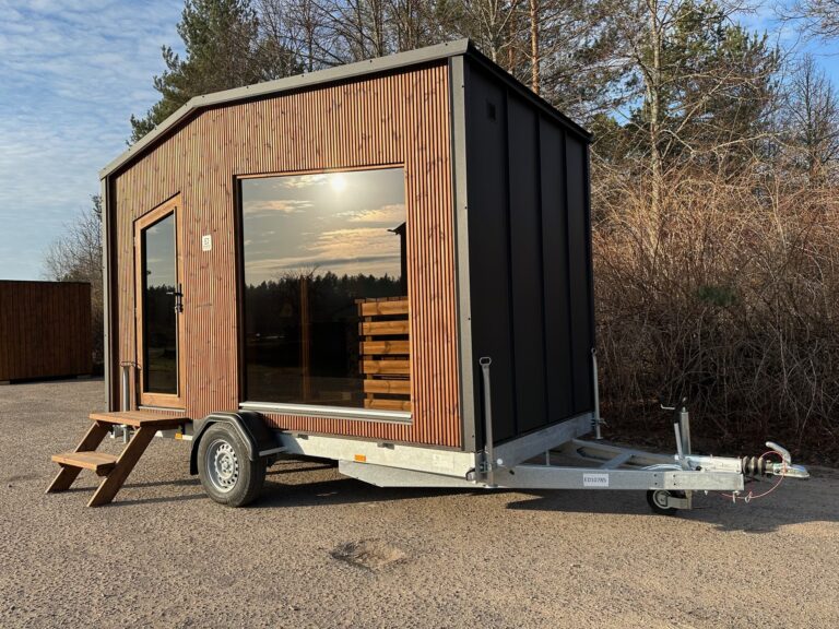 - Anhänger mit Einzelachse mit Bremsen (nicht für 4-5 m lange Saunen geeignet)