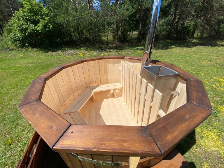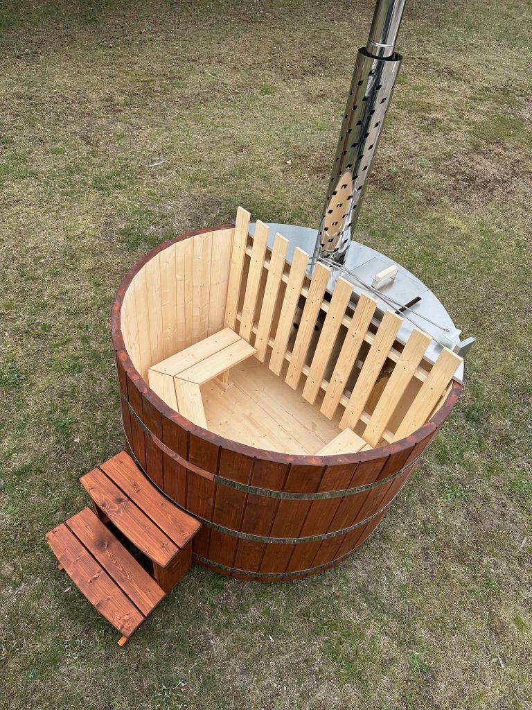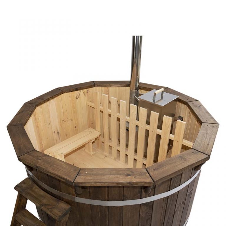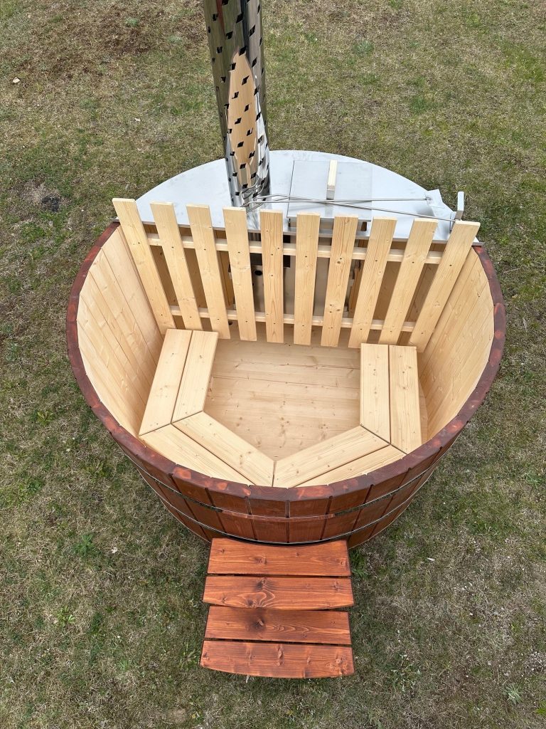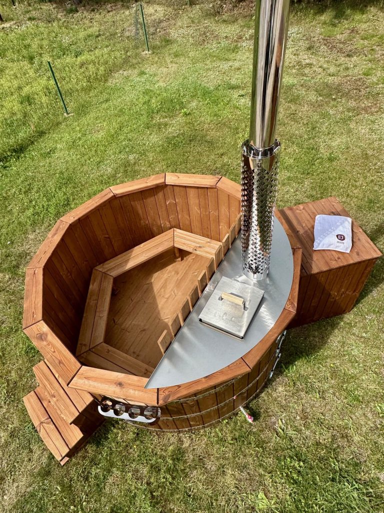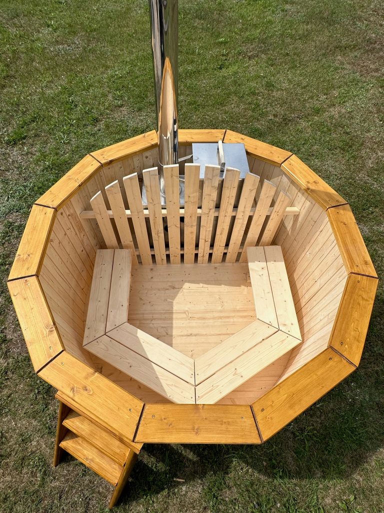 Der interne Ofen bietet eine schnellere Aufheizzeit als ein externer holzbefeuerter Ofen, da fast keine Wärme entweicht. Der Innenofen verbraucht etwa 25 % des Platzes in der Wanne, aber eine 180 cm lange Holzwanne kann immer noch bis zu 6 Personen beherbergen. Ein Innenofen bietet mehr Gemütlichkeit, da Sie nahe am Feuer sitzen können. Allerdings gibt es auch ein paar Nachteile – Innenöfen können für Kinder gefährlich sein, und auch die Reinigung nimmt mehr Zeit in Anspruch.
