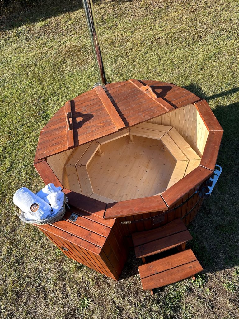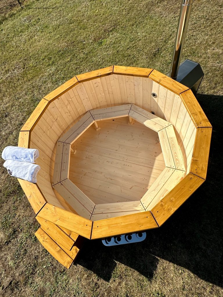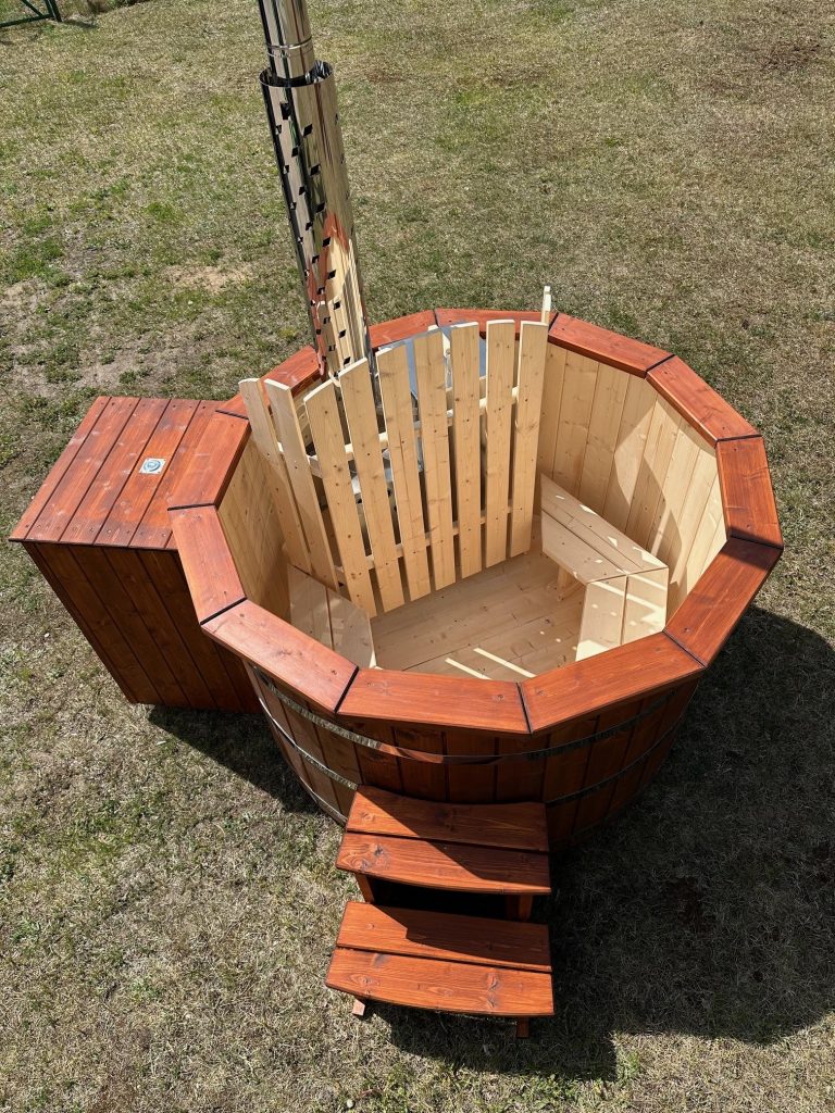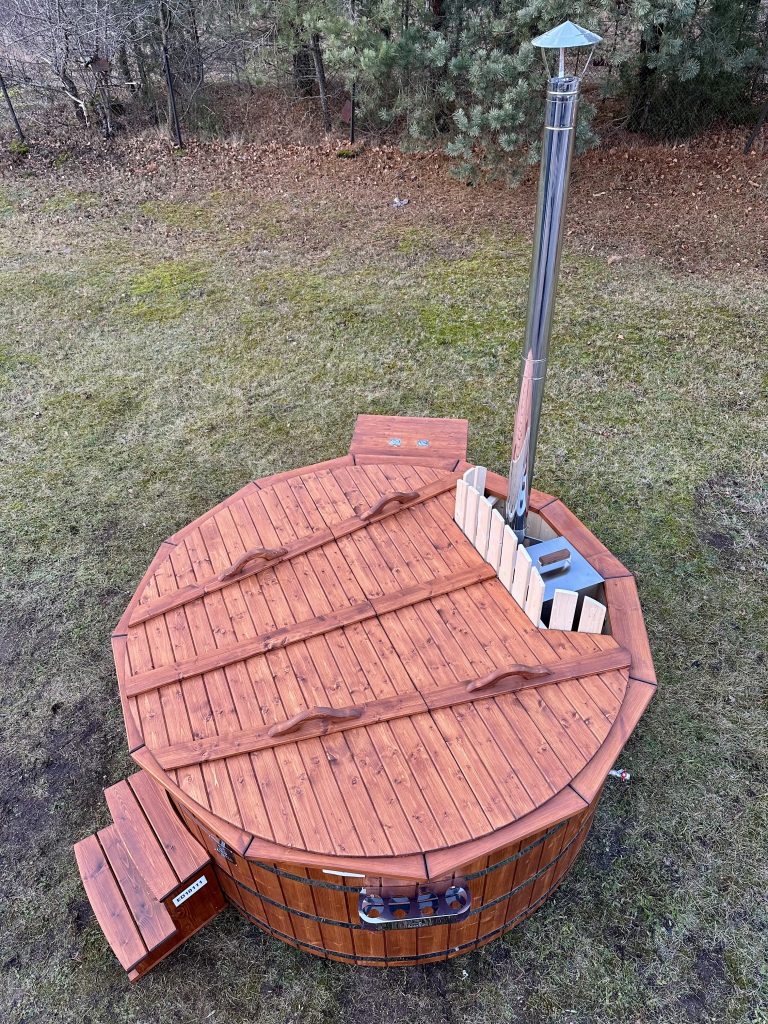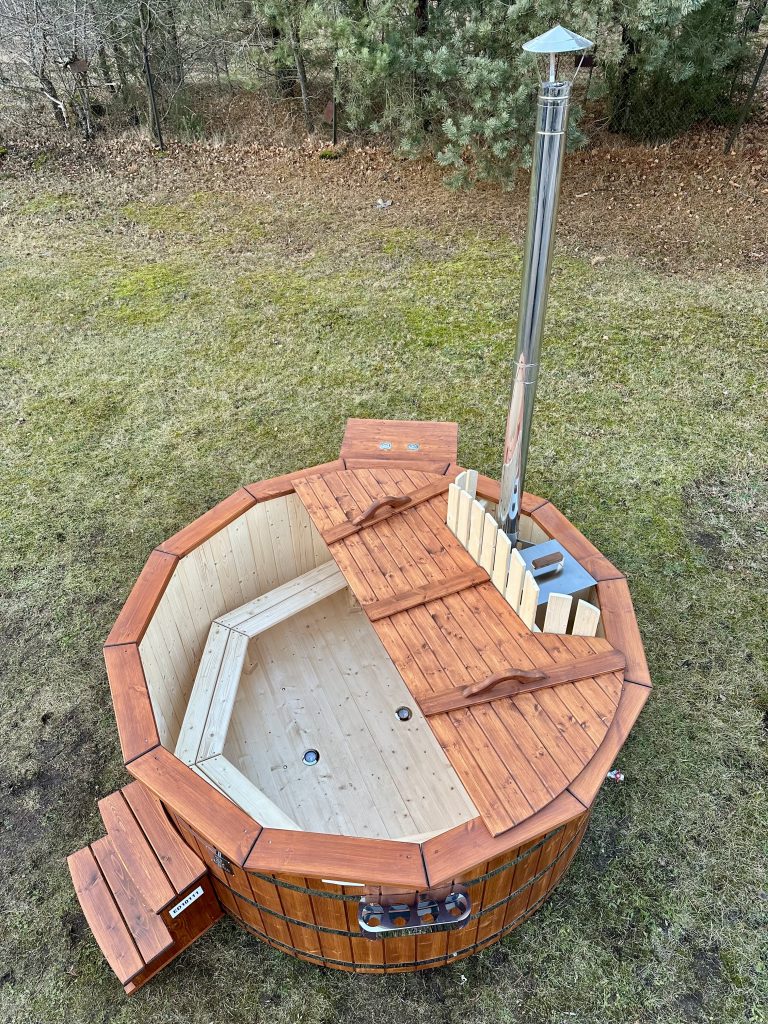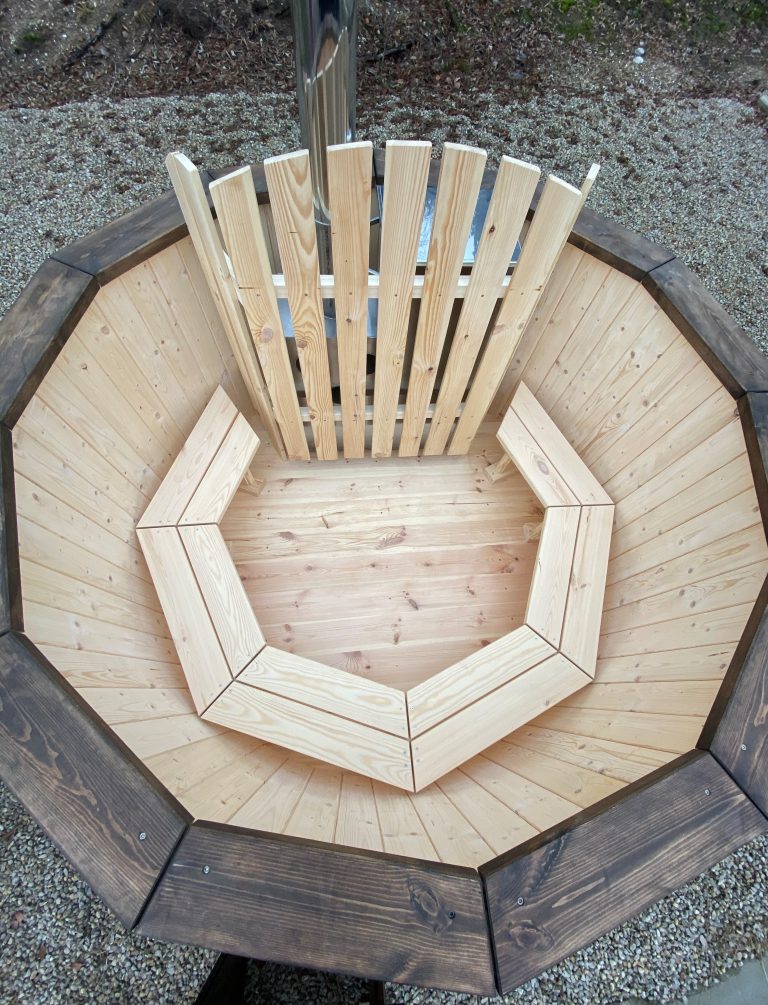 Der interne Ofen bietet eine schnellere Aufheizzeit als ein externer holzbefeuerter Ofen, da fast keine Wärme entweicht. Der Innenofen verbraucht etwa 25 % des Platzes in der Wanne, aber eine 180 cm lange Holzwanne kann immer noch bis zu 6 Personen beherbergen. Ein Innenofen bietet mehr Gemütlichkeit, da Sie nahe am Feuer sitzen können. Allerdings gibt es auch ein paar Nachteile – Innenöfen können für Kinder gefährlich sein, und auch die Reinigung nimmt mehr Zeit in Anspruch.