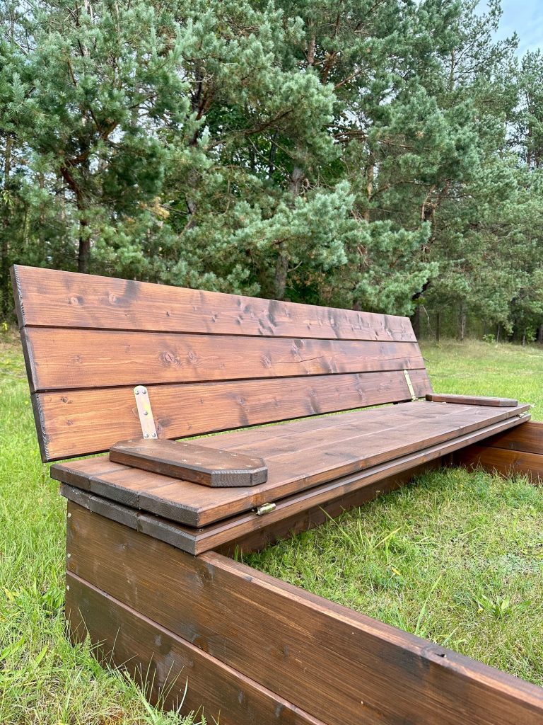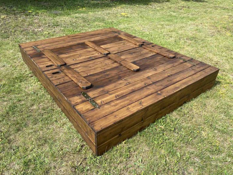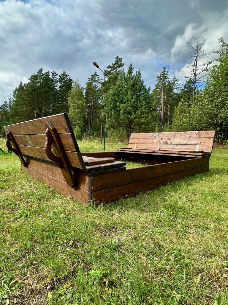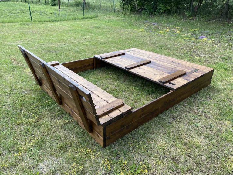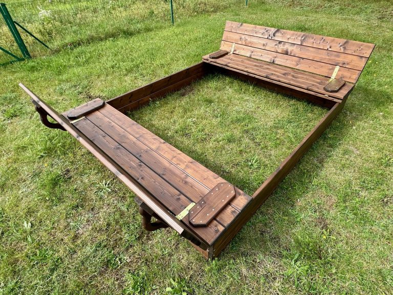 Mit seinem pflegeleichten Design, der universellen Abdeckung, die sich in Bänke umwandeln lässt, und seiner geräumigen Größe bietet der Holzsandkasten einen sicheren, weitläufigen Platz für Kinder zum Spielen.