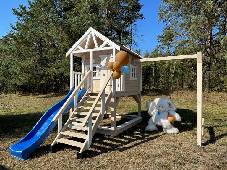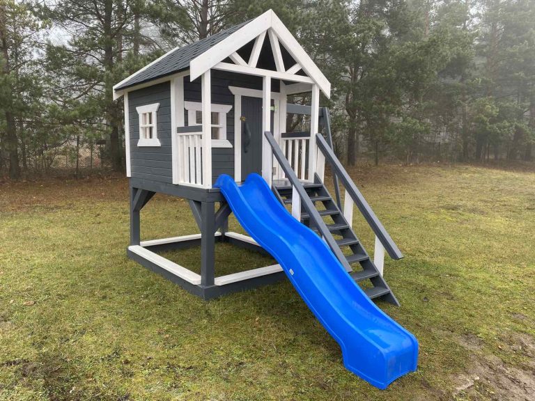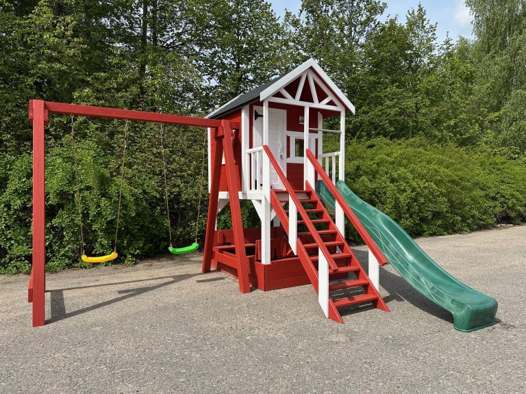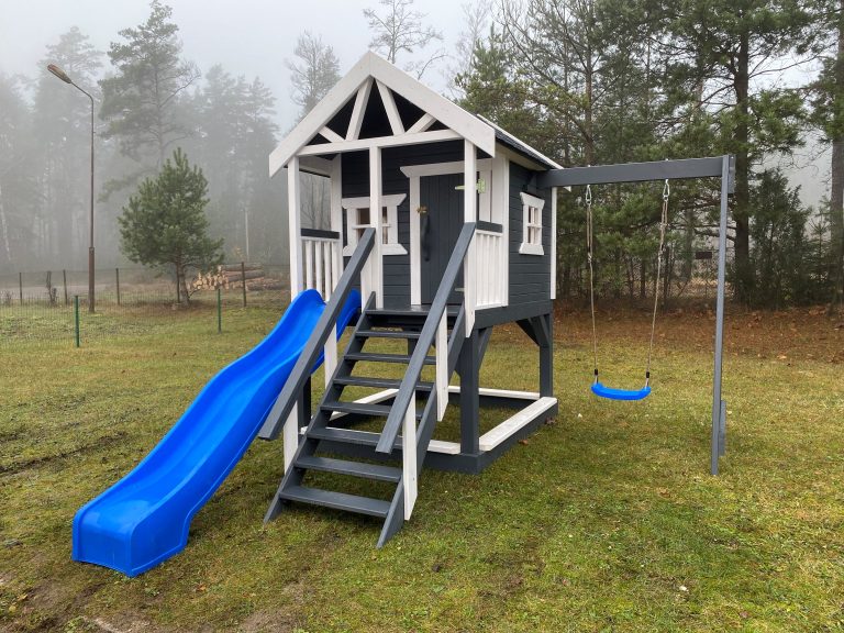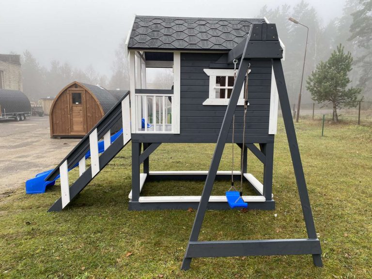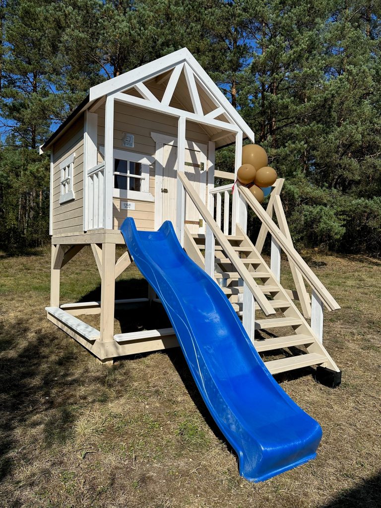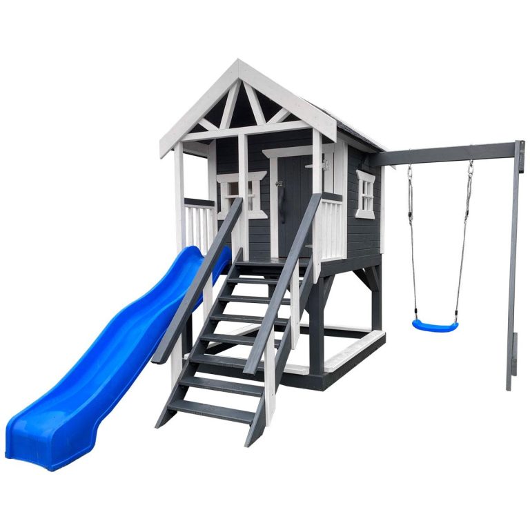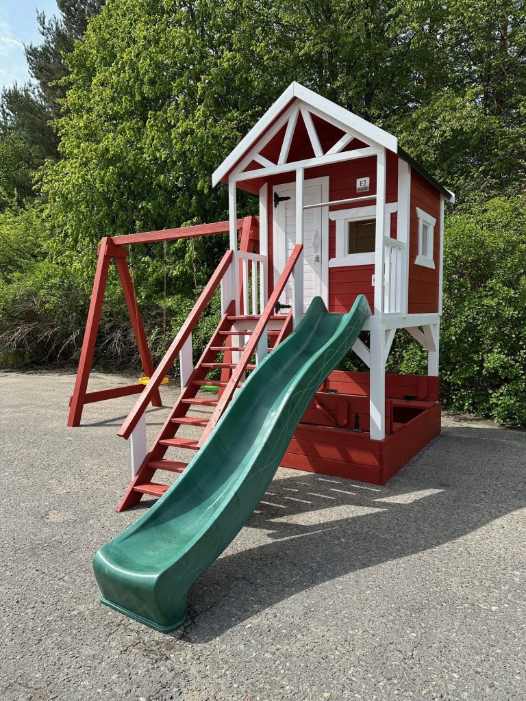 Fabelhaftes Spielhaus mit Schaukel aus Holz für aktive Kinder. Die Kinder können sich mit zwei Gurt-Schaukeln austoben und den Fahrtwind genießen, bevor sie die 2 Meter lange, rasante Rutsche hinuntersausen. Wenn es Zeit ist, sich auszuruhen, zu entspannen oder sich vor Regen zu schützen – das große Spielhaus steht direkt bereit.