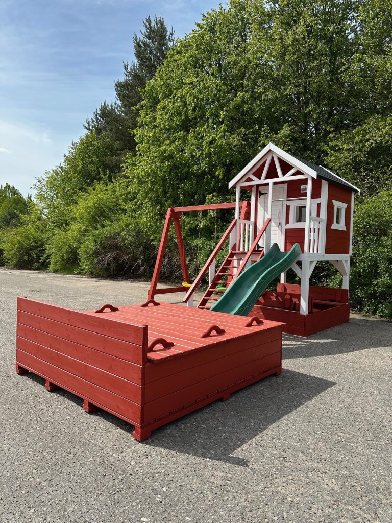 * Das Spielhaus mit Schaukel wird nur halbmontiert geliefert. Sie sind dafür verantwortlich, die Hebevorrichtungen an Ihrem Lieferort bereitzustellen.